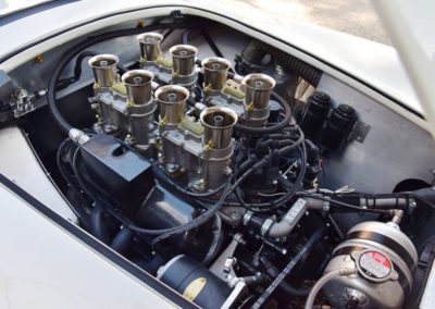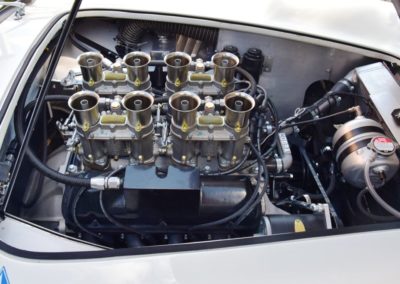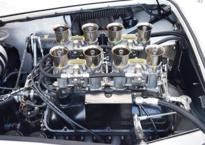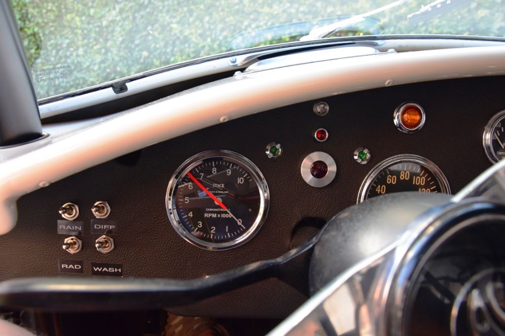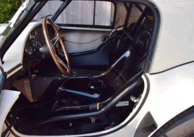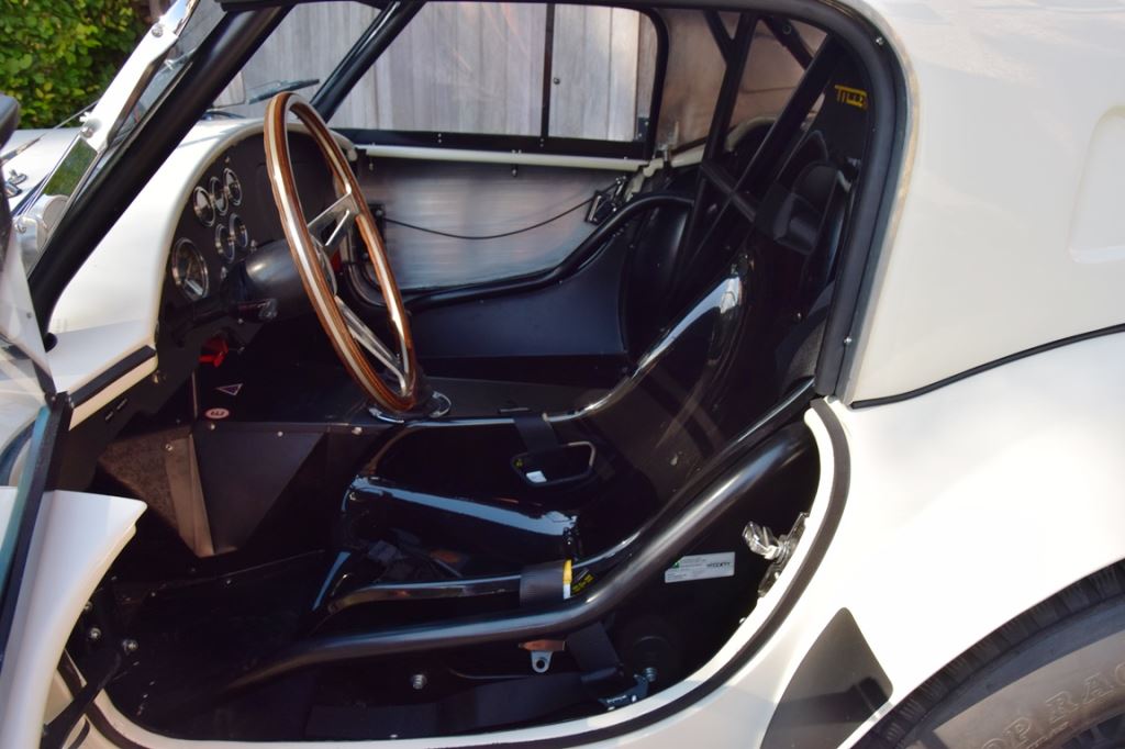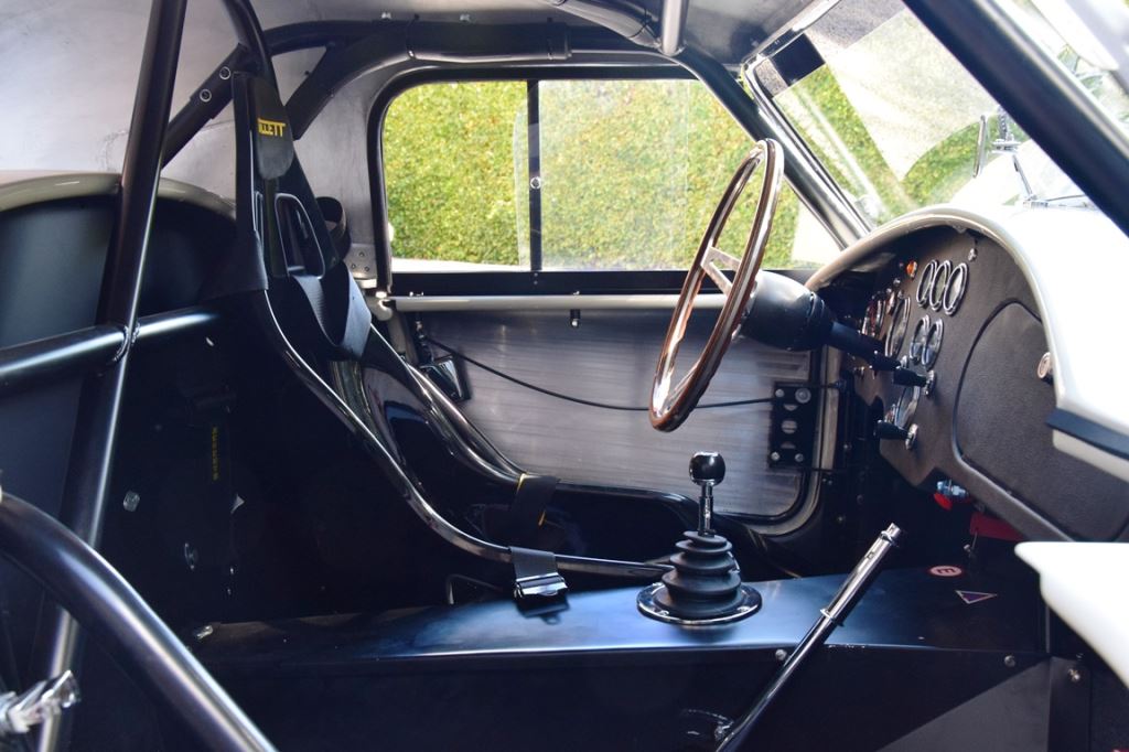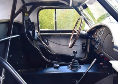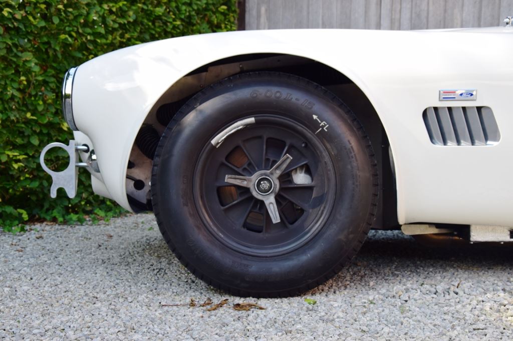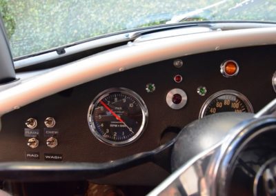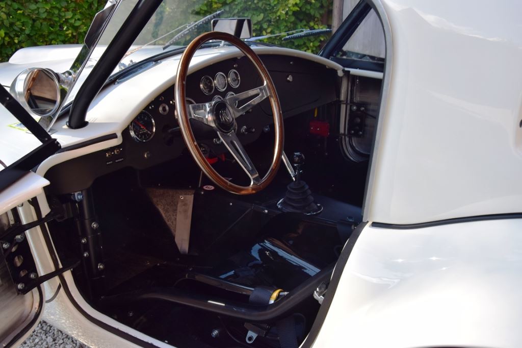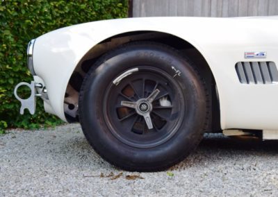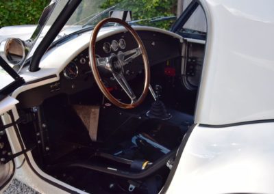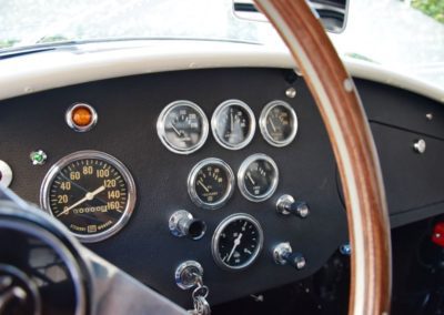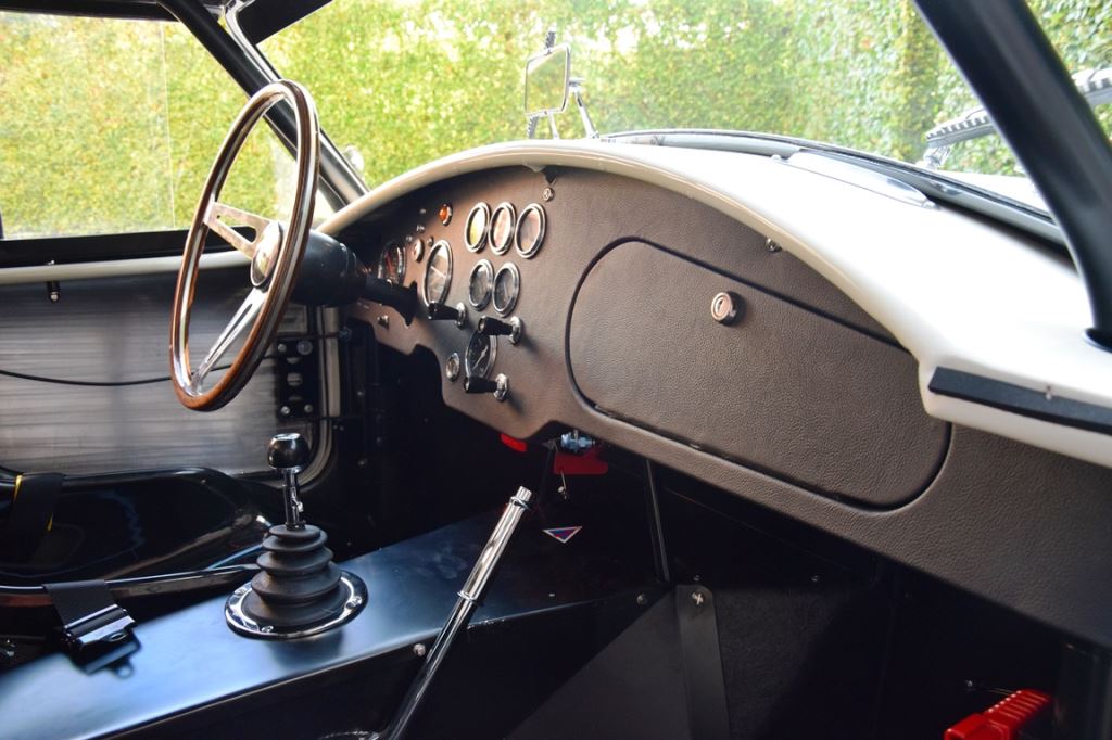 A fresh 289 Mathwall engine well revised by Burgol Racing Technologie Switzerland produce 460 bhp on the dyno. The exhaust is a full stainless steel system with 4 mufflers to suit modern noise requirements. The brand new T10 gearbox is made in accordance with FIA recognition form 1, and paired to a final drive with H/D output shafts. The rear diff is correct cast iron 4HU Salisbury differential mounted with homologated diff cooling and 3.77 ratio. The Cobra has a brand new 140 liters Premier Bladder fuel tank with 20L reserve tank and dual Holley fuel pumps for durability. The suspension has rosejointed A-arms and Koni 8211 shock absorbers which were especially developed for racing Cobra’s (and the very best you can use on these cars). The leafsprings are heavily upgraded for high speed racing. The brakes have Tilton main cylinders with Girling CR and ORA calipers fitted with Mintex brake pads. To get all this power on the road, this beautiful Cobra sits on Crosthwaite & Gardiner magnesium wheels fitted with L-section Dunlop Racing tyres. Everything is very lightweight, including the full aluminium body and Le Mans hardtop. The well appointed interior is period correct, with the fully original Cobra 289 dashboard layout and rare Stewart Warner gauges, correct Ford toggle switches and the typical wooden steering wheel. The driver is perfectly installed in a lightweight Tillet racing seat with full FIA approved 6-point harness and FIA specification FULL roll cage – all inspected and approved.