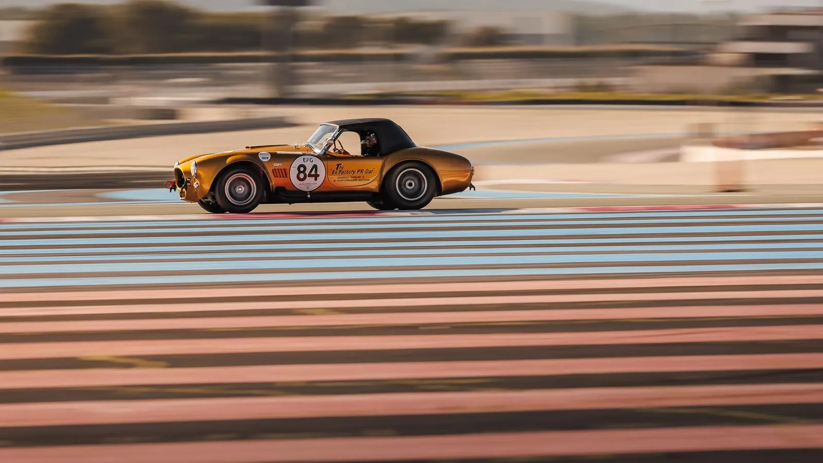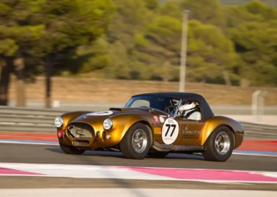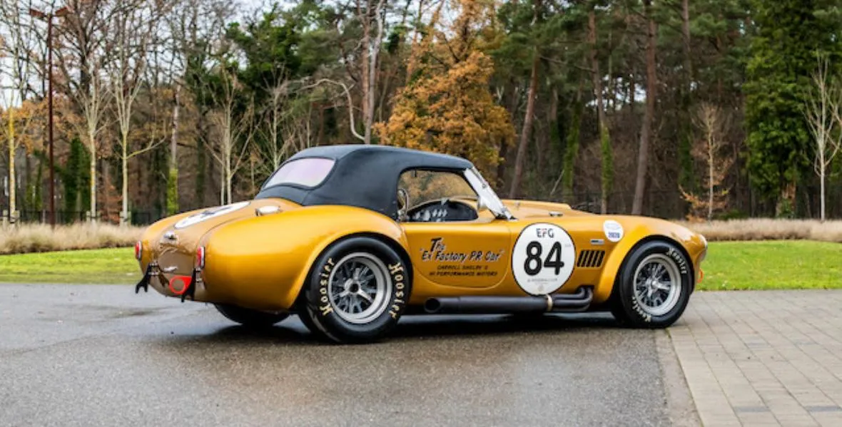 La Cobra proposée ici est une Shelby d’essai de 1965 (châssis CSX3120), un exemplaire accidenté en Europe à l’époque.